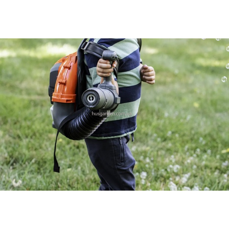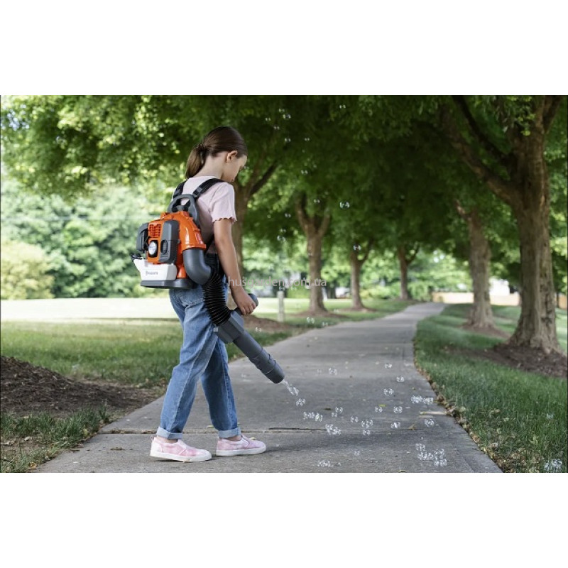 Іграшковий повітродув Husqvarna (5462723-01) має вигляд і звучить як справжня повітродувка Husqvarna 345BT, а також працює як машина для мильних бульбашок.