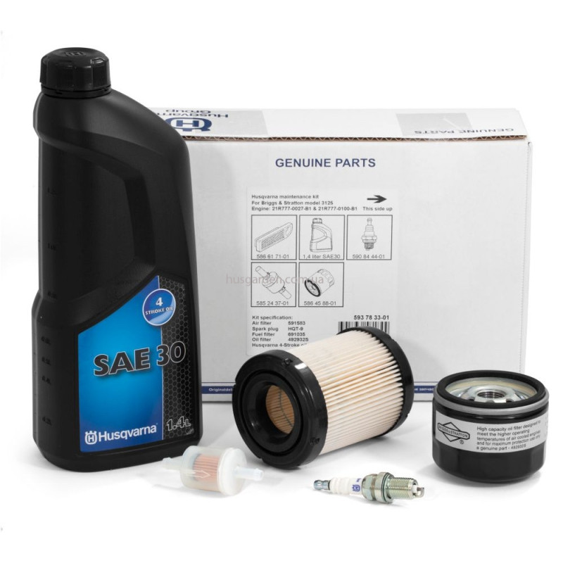 Сервисный комплект состоит из: Воздушный фильтр BriggsStratton 594201 (5822850-50); Моторное масло Husqvarna 4T SAE30 1,4л: Масляный фильтр BriggsStratton 492932S (5864588-01); Свеча зажигания Husqvarna HQT-9 (5908444-01); Воздушный фильтр BriggsStratton 691035 (5852437-01).